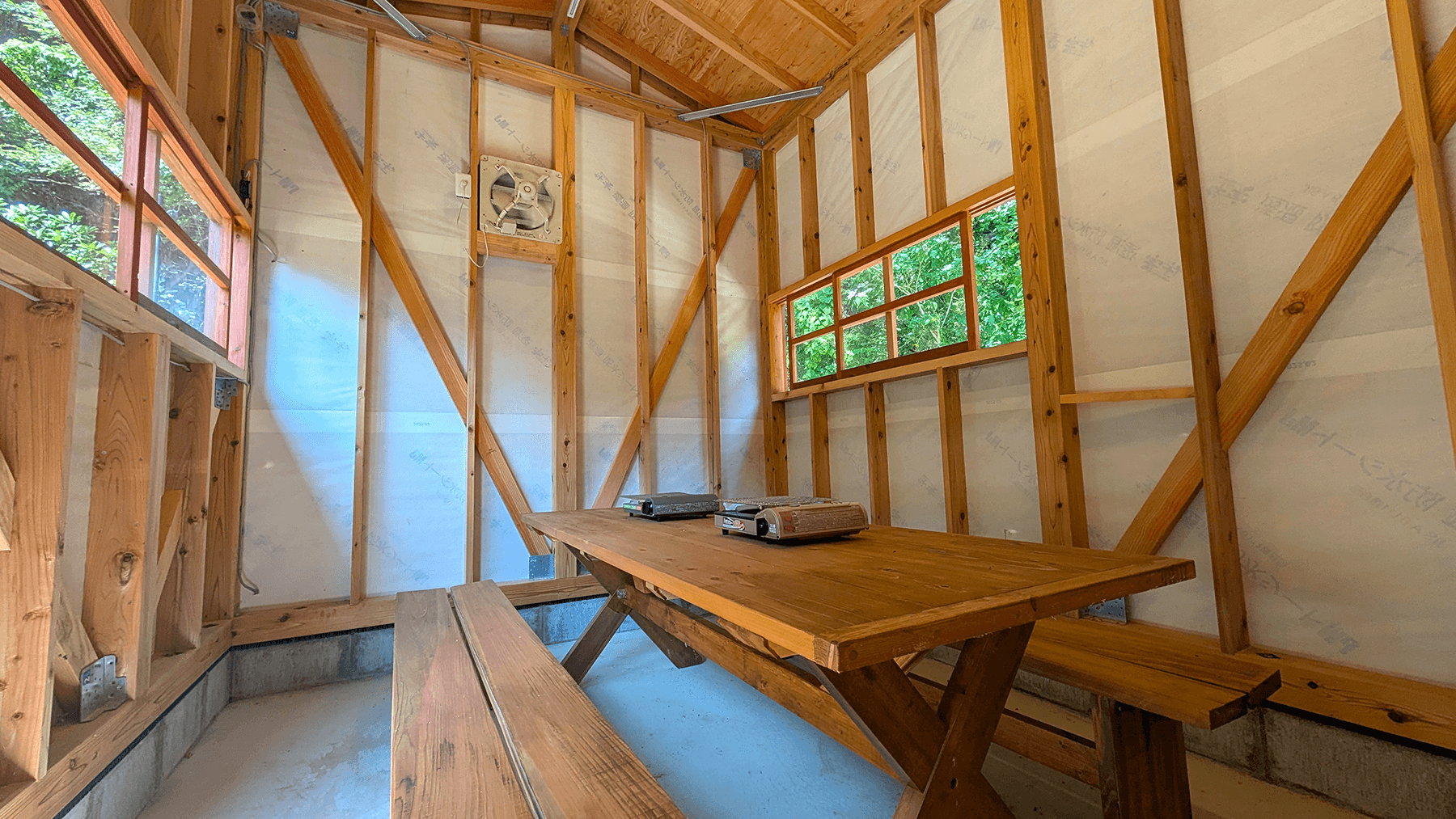 雨でも安心の屋根付きテラスでバーベキューを満喫。ガスタイプのコンロを完備し、気軽にアウトドアの食事を楽しめます。