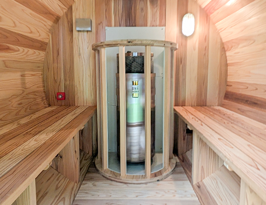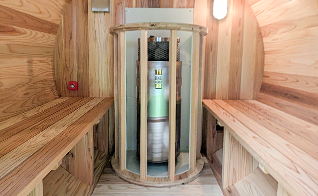 森に囲まれた貸別荘の裏庭に設置されたバレルサウナ。樽型の木製デザインは熱を均等に伝え、心地よい香りと温もりを提供。プライベートな空間でゆったりと汗を流し、心身ともにリフレッシュ。サウナ愛好家に人気の“ととのう”体験を、自然の中で堪能できます。
