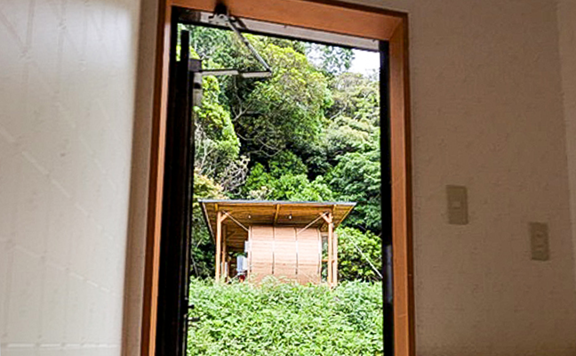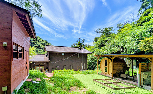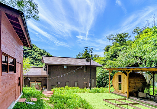 森に抱かれた一棟貸し別荘の奥に設置された、開放感あふれるバレルサウナ。